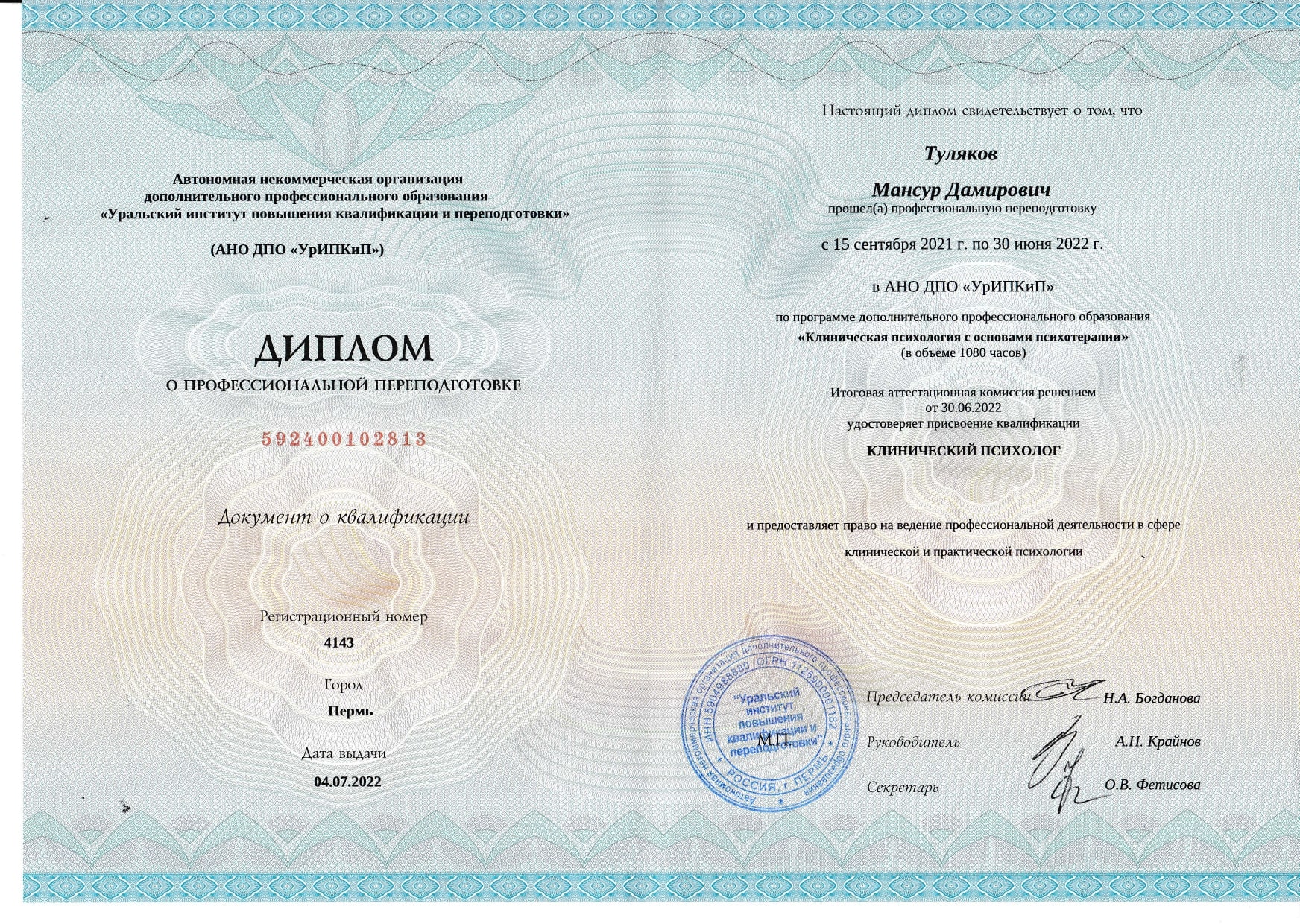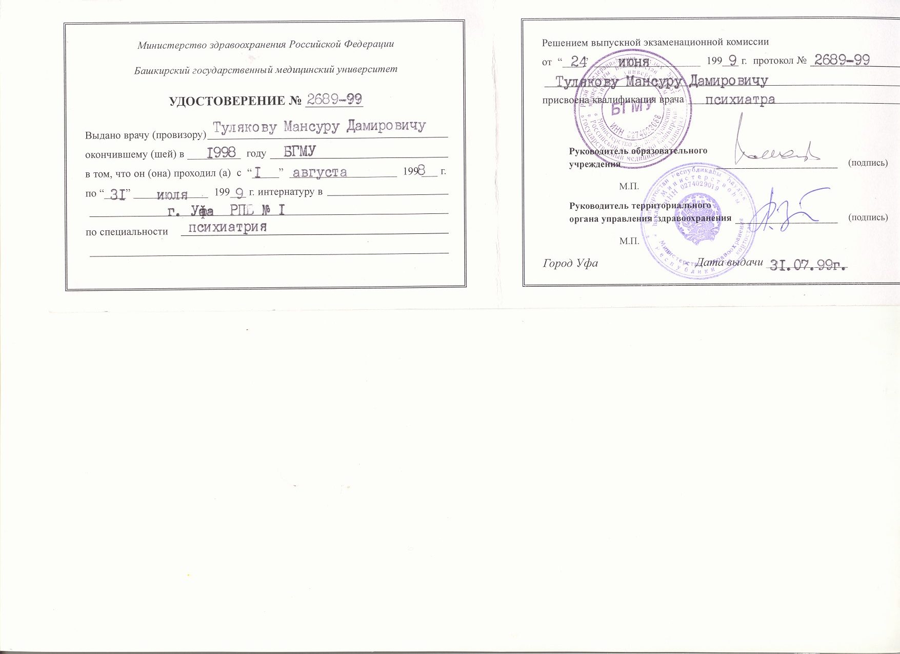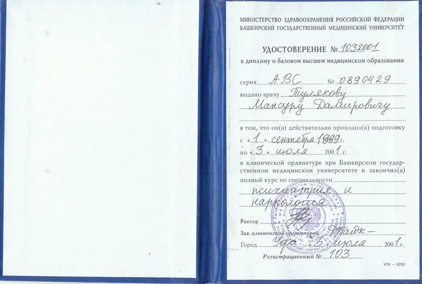 Башкирский государственный медицинский университет, интернатуру по психиатрии, клиническую ординатуру по психиатрии и наркологии.Кандидат медицинских наук. Работал начмедом в Уфимском городском наркологическом диспансере.